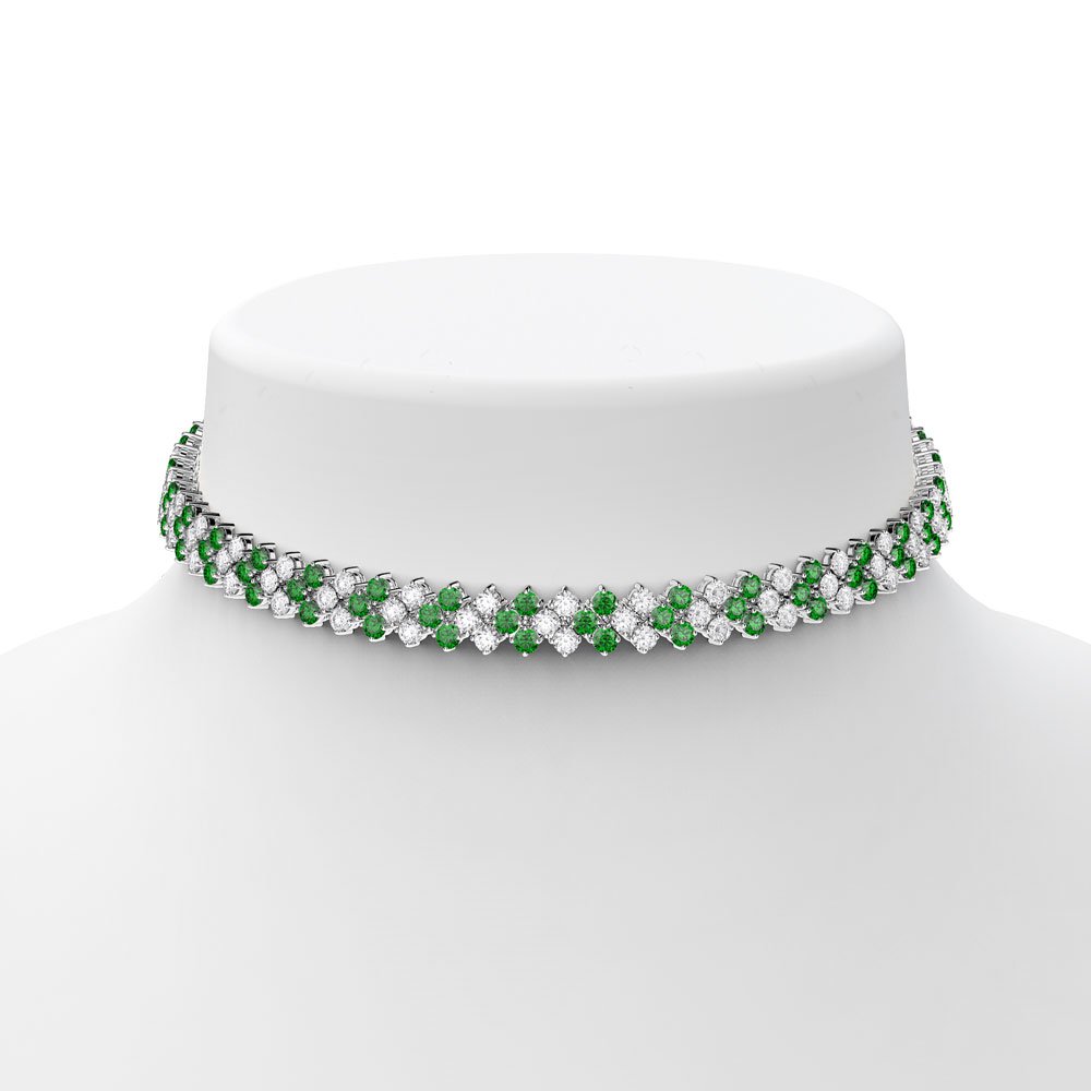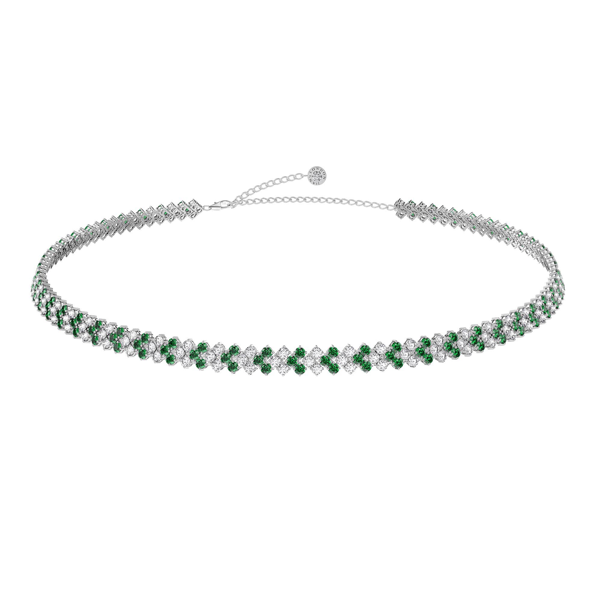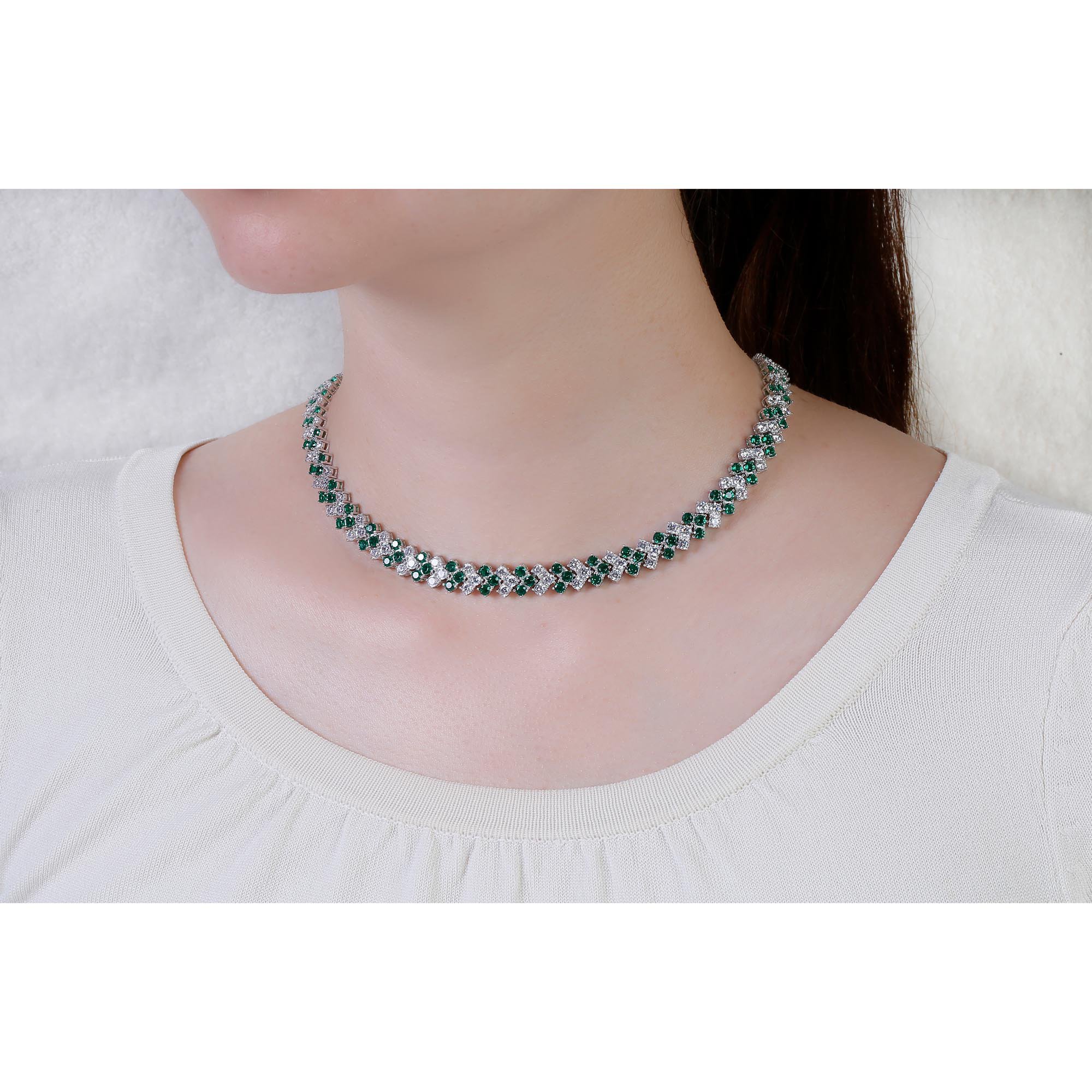 Timeless classic. Rich in brilliance, this three row adjustable tennis necklace, also can be worn as a choker or collar necklace, showcases 180 sparkling Emerald and Diamond CZ in prong setting