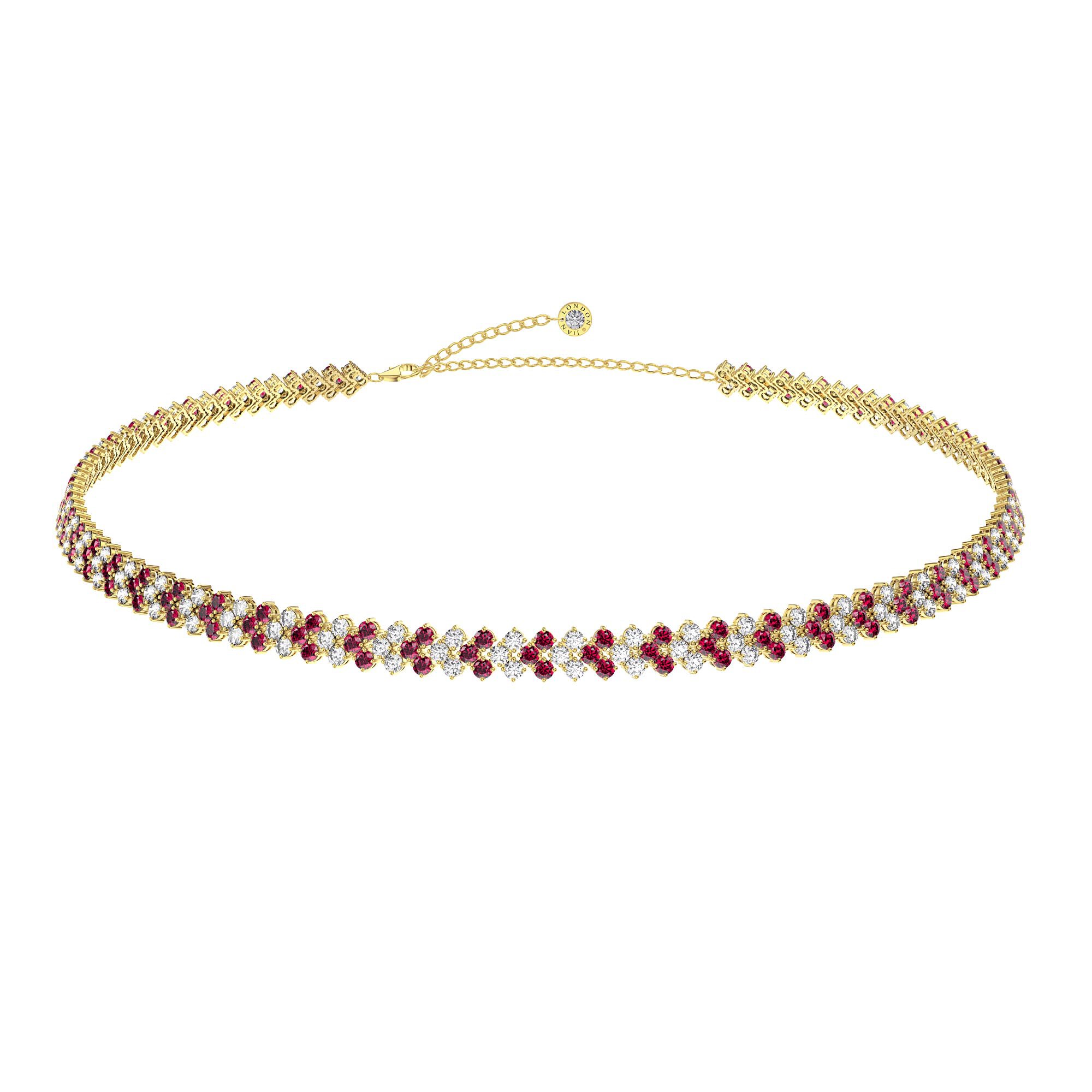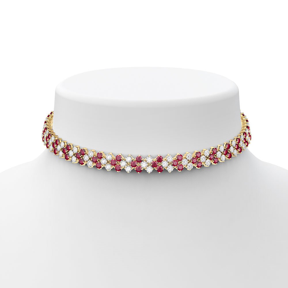 Timeless classic. Rich in brilliance, this three row adjustable tennis necklace, also can be worn as a choker or collar necklace, showcases 180 sparkling Ruby and Diamond CZ in prong setting