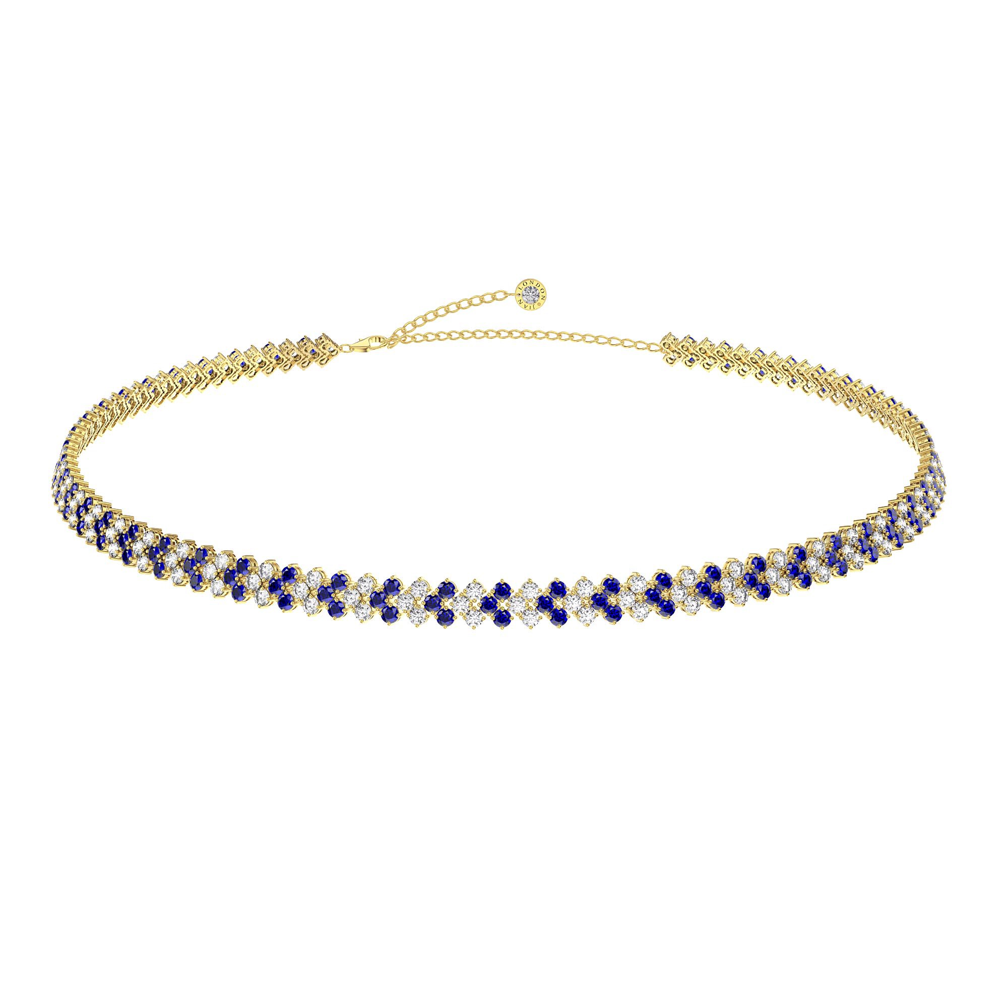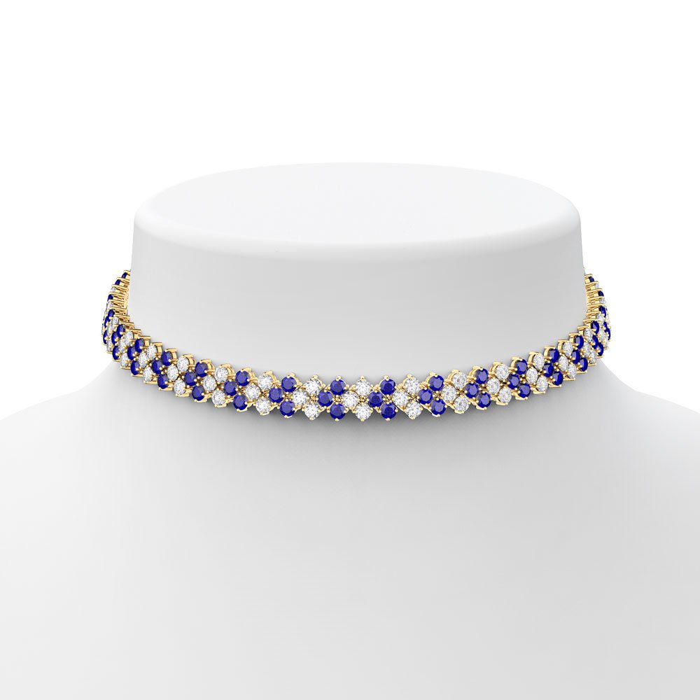 Timeless classic. Rich in brilliance, this three row adjustable tennis necklace, also can be worn as a choker or collar necklace, showcases 180 sparkling Blue and White Sapphire in prong setting