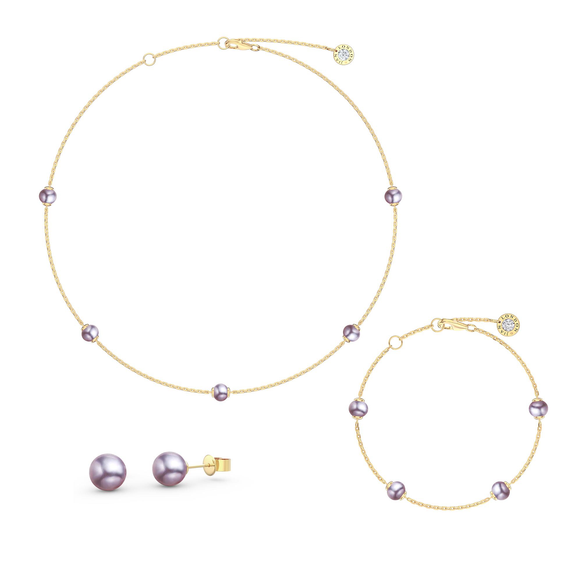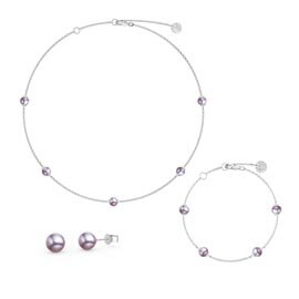 9 of 7.5-8.0mm and 2 of 5.5-6.0mm cultured freshwater Lilac Pink pearls. 2 of 3mm Laboratory-Grown White Sapphire
