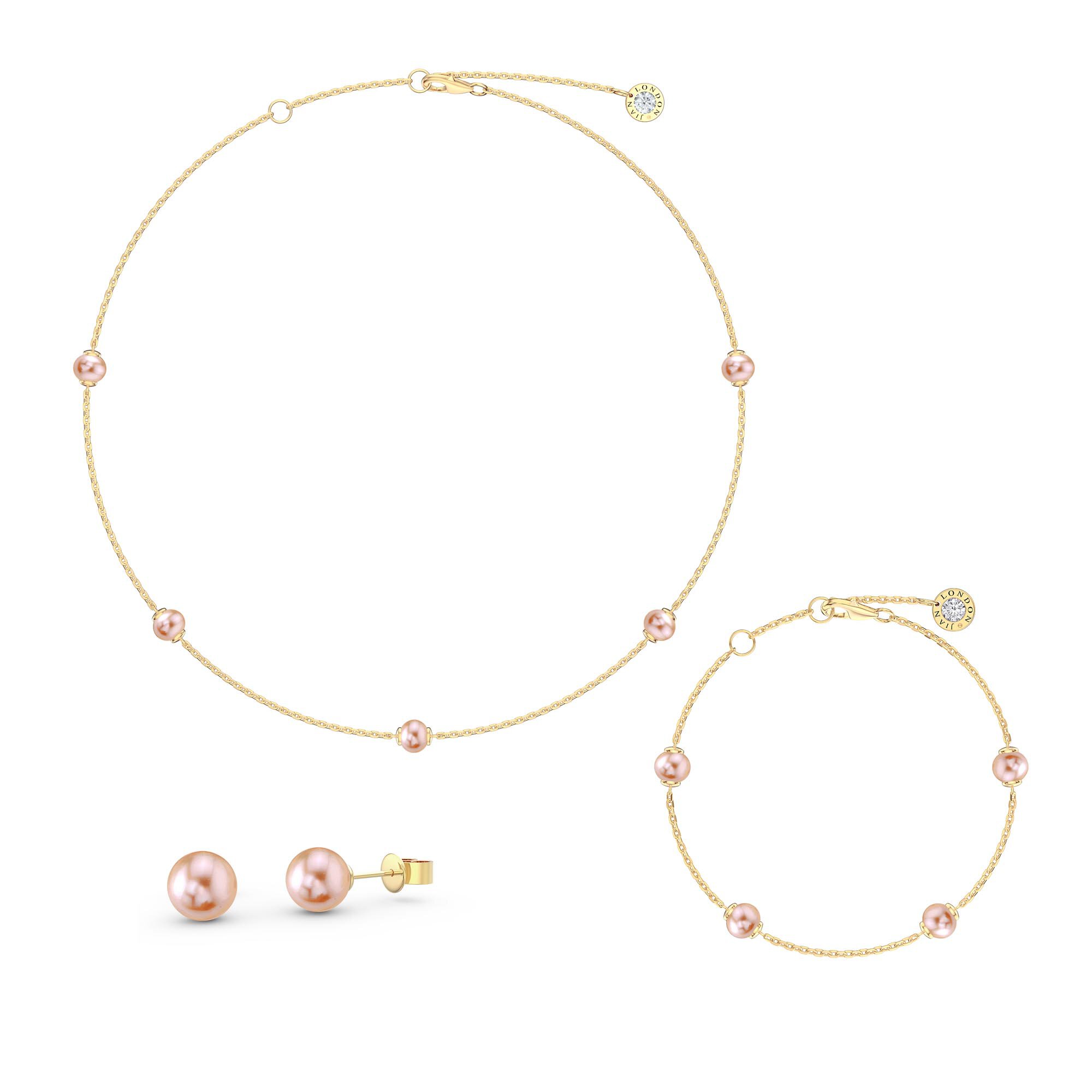 9 of 7.5-8.0mm and 2 of 5.5-6.0mm cultured freshwater Peachy Pink pearls. 2 of 3mm Laboratory-Grown White Sapphire