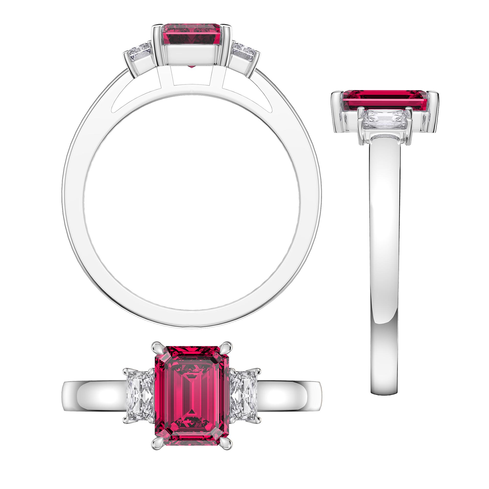 Approx. 2.0ct ( 1 x 6.0mm by 8.0mm, 2 x 2mm by 4mm) Emerald Cut Laboratory-Grown Ruby and White Sapphire