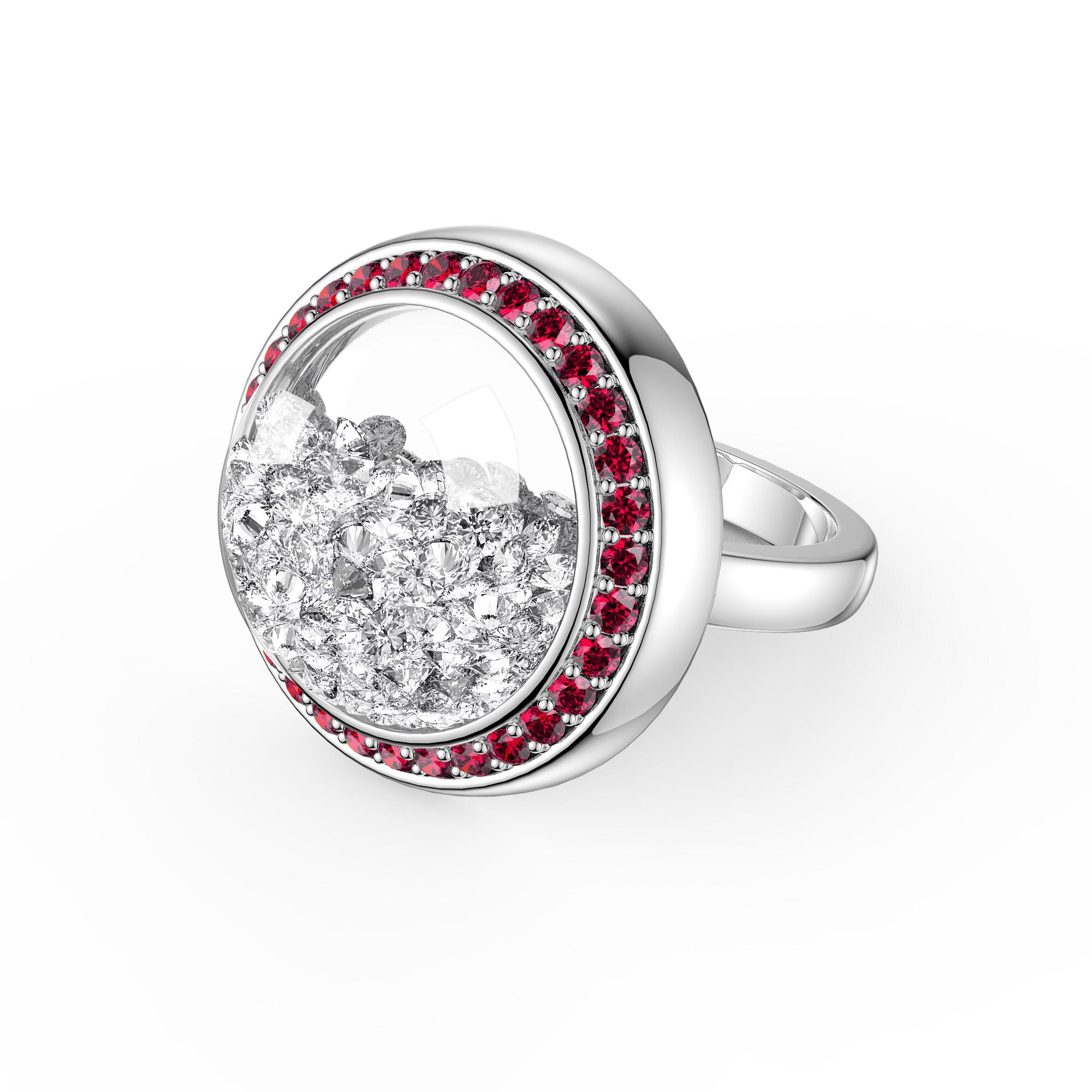 International Jewellery London Award winning design. Stunning free moving Diamonds sparkles and dances within a liquid filled Sapphire dome. The effect is totally mesmerizing